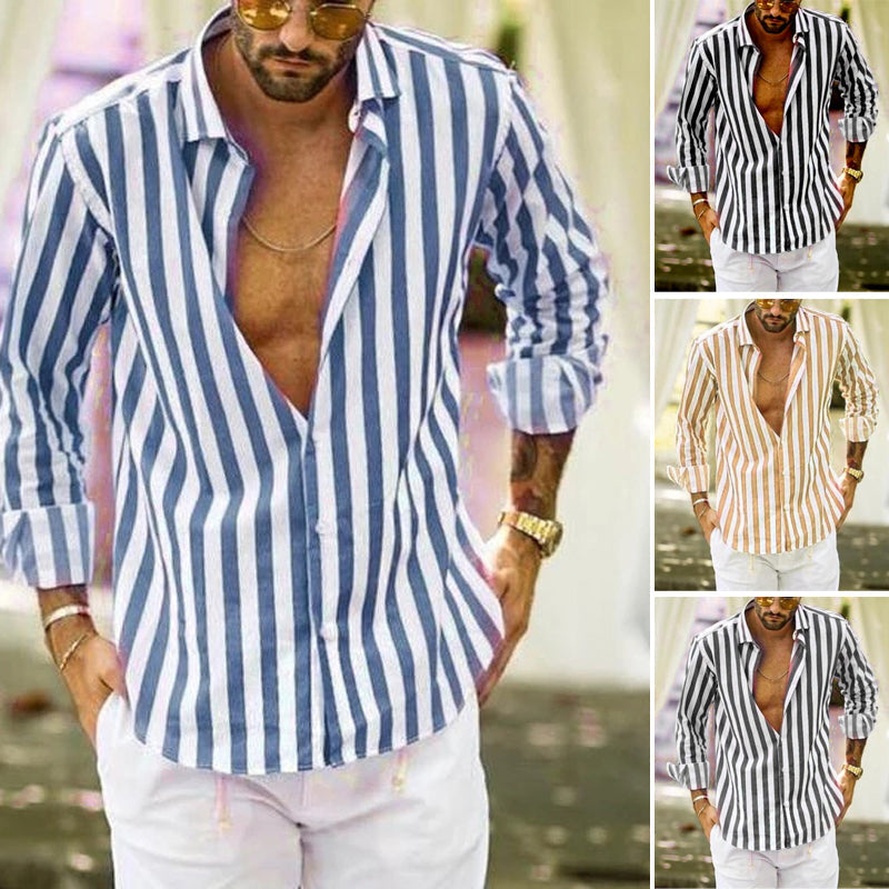 Men's Cotton Linen Striped Button Down Long Sleeve