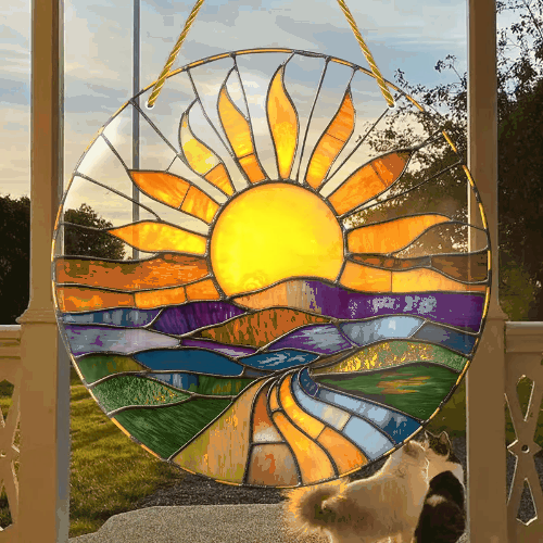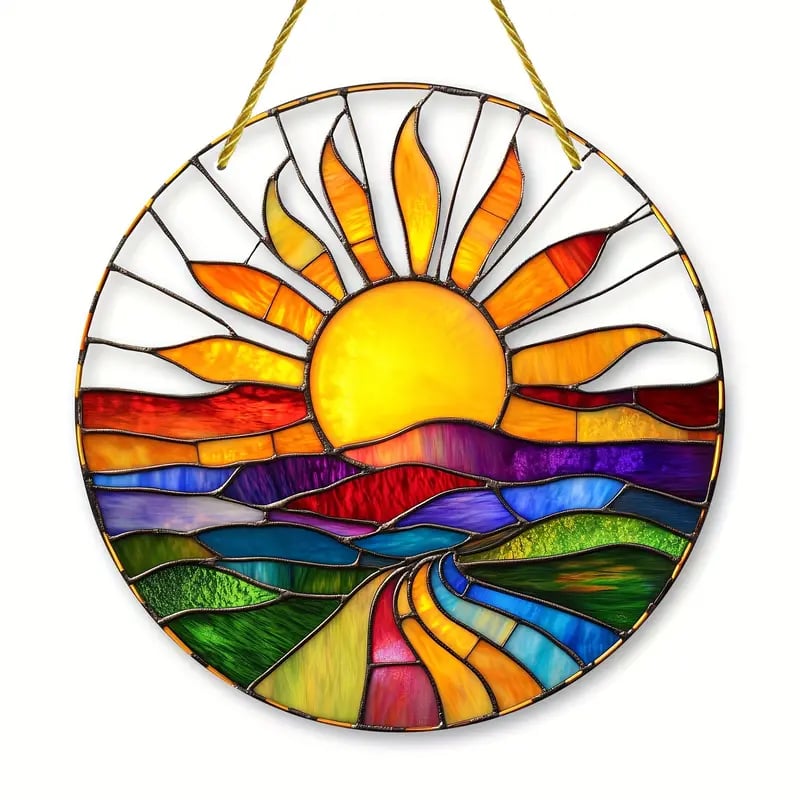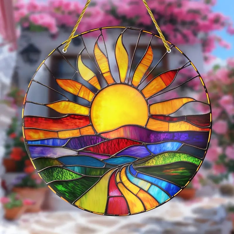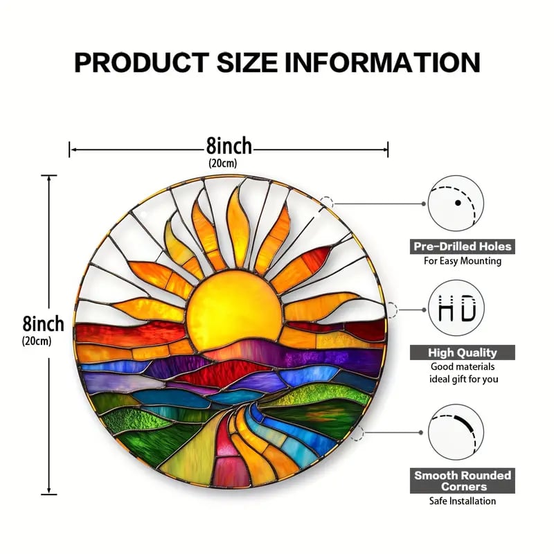 ☀️Radiant Sunburst Design: This suncatcher displays a stunning sunburst pattern made of colorful geometric shapes, symbolizing hope and rebirth, bringing a strong sense of vitality.