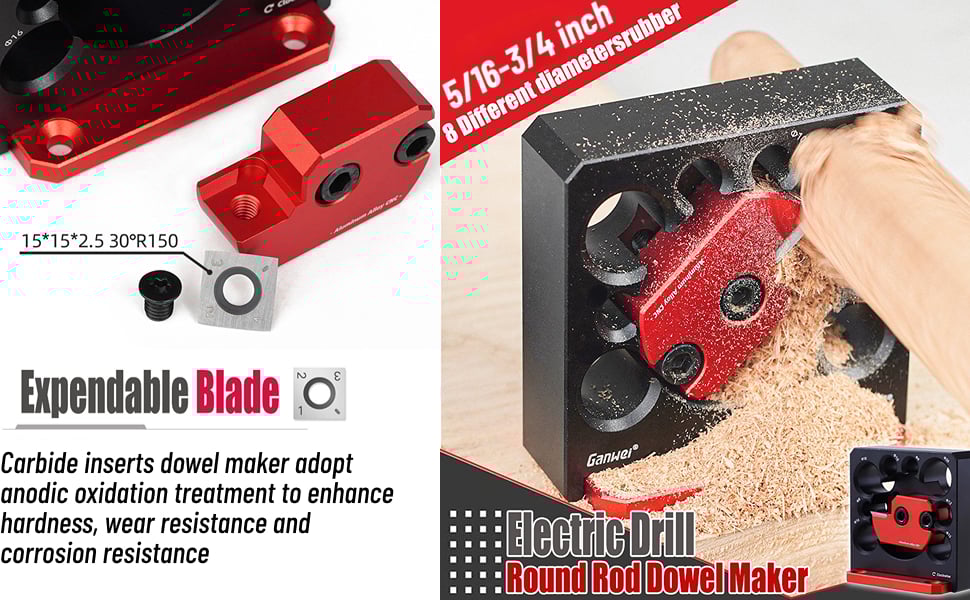 Easy to Operate: The dowel making jig with carbide inserts is easy to operate. Simply loosen the screw and rotate the red blade holder to the desired diameter. Retighten the screw and start making. The included blades are also interchangeable.