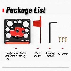 comfortable and provides a long service life.rning Holes: The dowel maker jig is adjustable and comes with eight different diameter turning holes. By loosening the screw and rotating the red tool holder, you can easily set the desired diameter for your dowels.