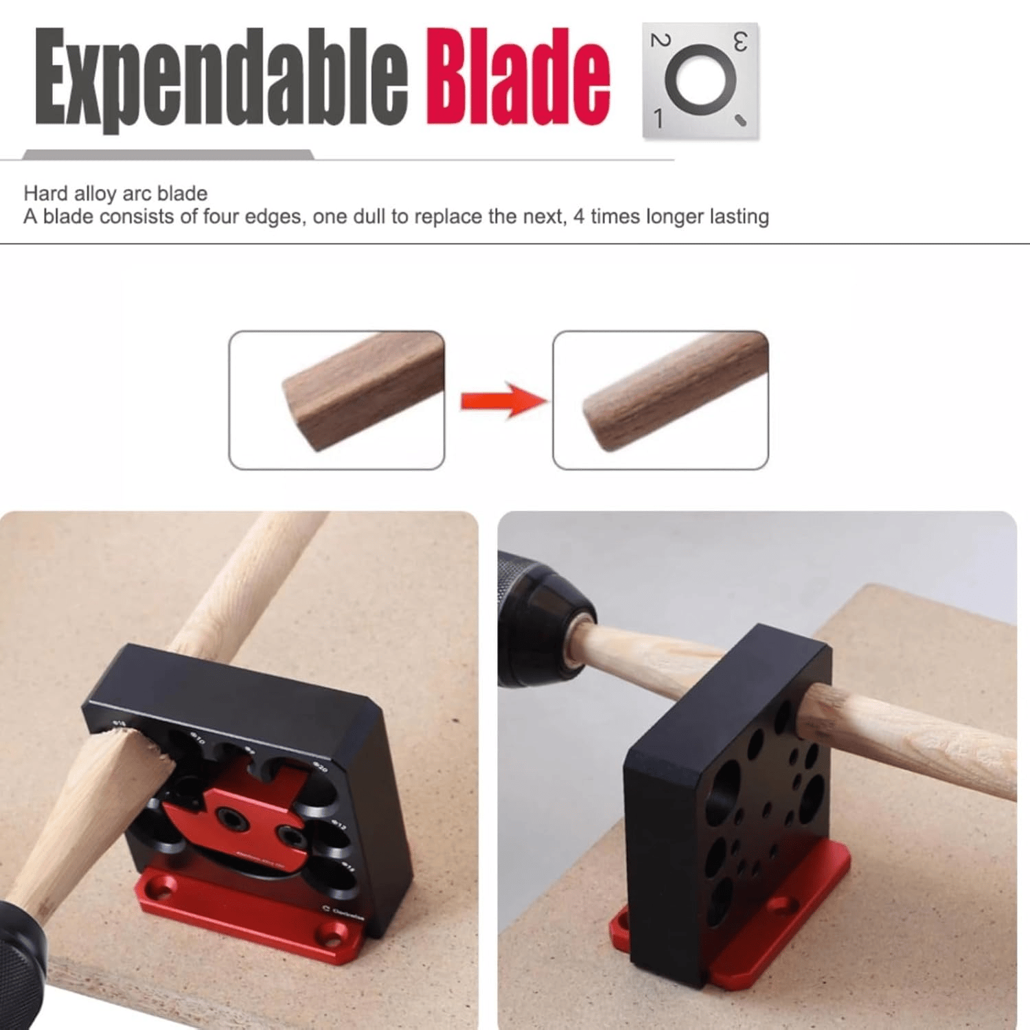 Smooth Cutting: The dowel maker uses disposable curved carbide blades for a smoother cutting experience. When the blades become dull, the dowel jigs can be rotated to make them as sharp as new, and a single blade can be rotated up to 4 times.