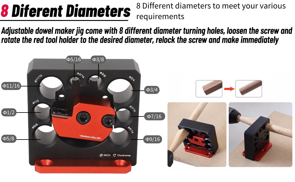 Adjustable dowel maker jig come with 8 different diameter turning holes, loosen the screw and rotate the red tool holder to the desired diameter, relock the screw and make immediately