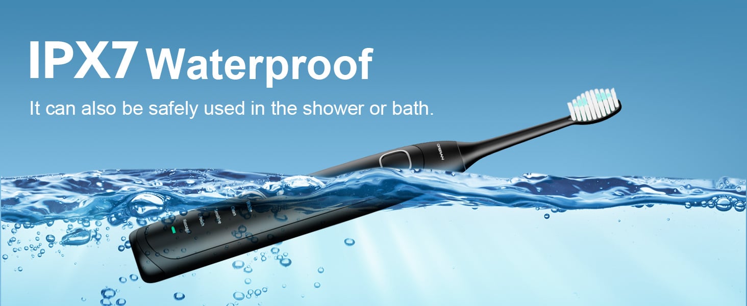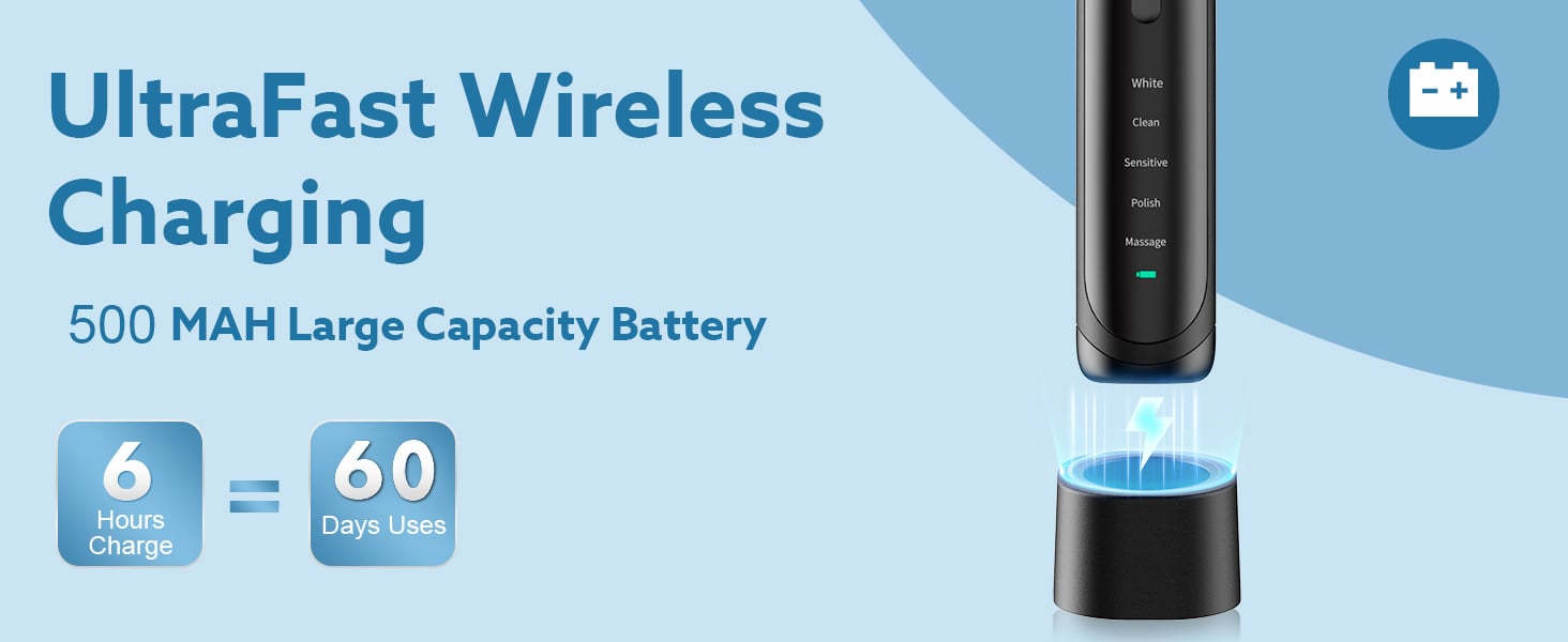 60-Days Battery Life & IPX7 Waterproof: A full charge takes 6 hours & provides a minimum of 60 days of usage (2 uses per day). The toothbrush can be used while in the bath or shower, but be sure to dry it off before attempting to charge it.