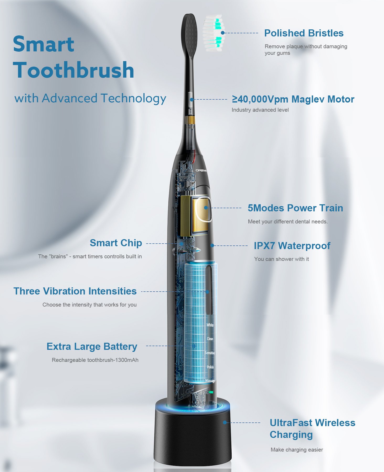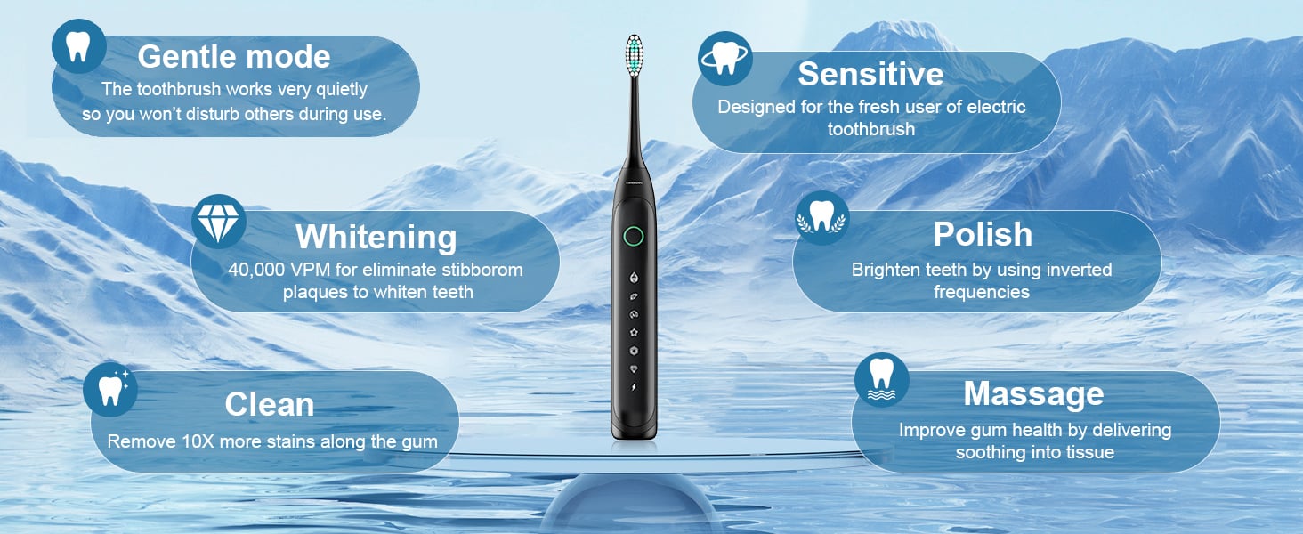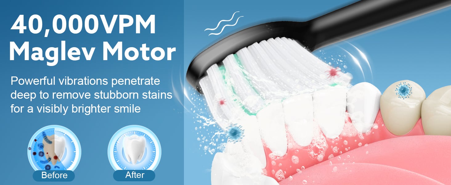 40,000 VPM Smart Electric Toothbrush: Up to 40,000 VPM high vibration sonic toothbrush. Remove up to 99.99% of plaque & stains for a deep clean along the gumline & between the teeth.