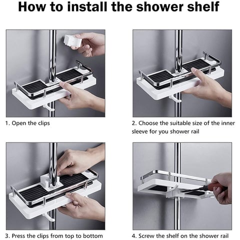 - ADJUSTABLE HEIGHT - The Shower Shelf can hold shower,gel,shampoo,facial cleanser,shower foam and other items.The height of the tray is adjustable.You can adjust the height of the Bathroom Shelf according to your habits.
