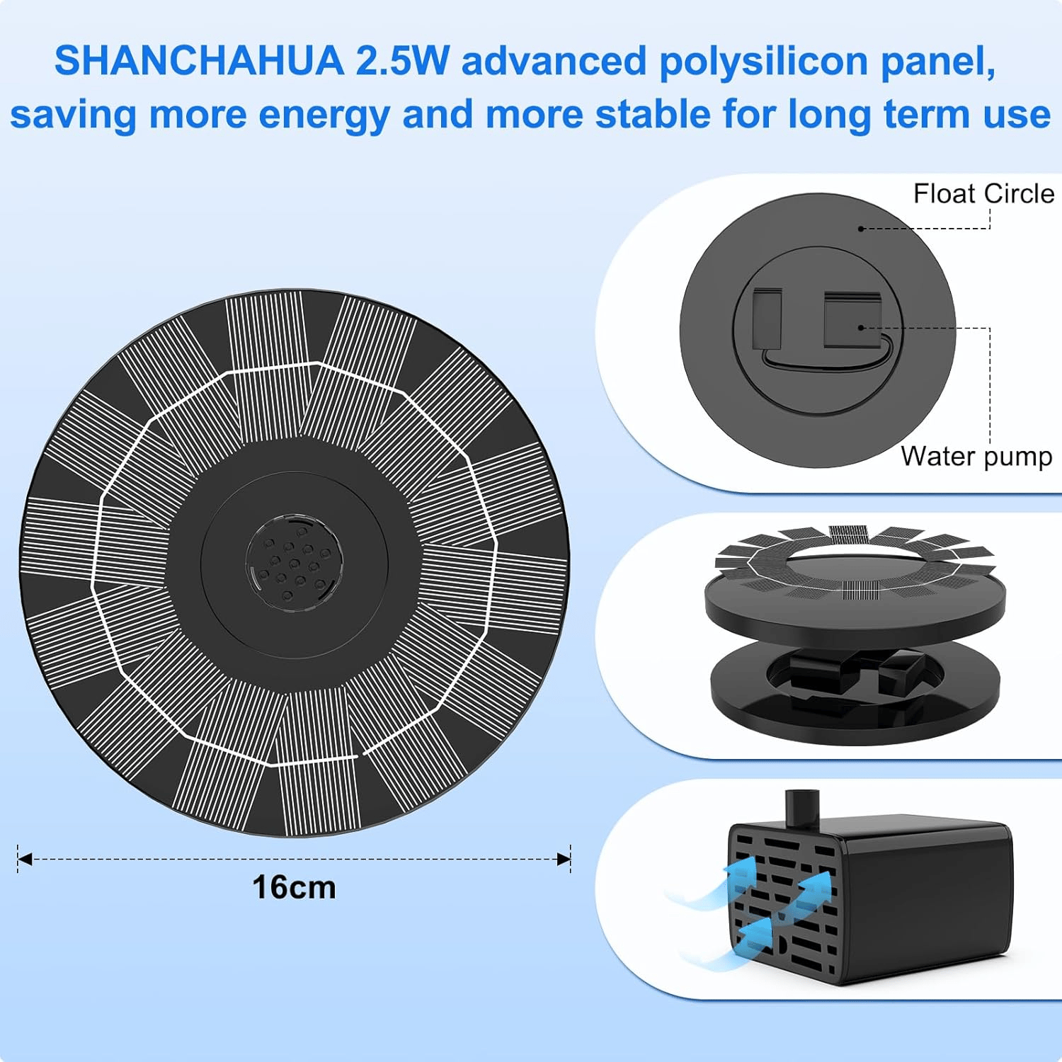 Solar Panel Diameter: 16cm (6.3 inches)