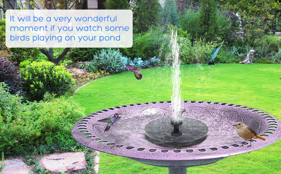 - Eco-friendly And Multi-purpose: This solar powered fountain pump does not need any power battery, no additional power supply, very environmentally friendly, which is very suitable for bird baths, fish tanks, ponds, swimming pools, gardens, outdoors, and oxygen circulating water. This fountain will attract hummingbirds and it is very interesting.