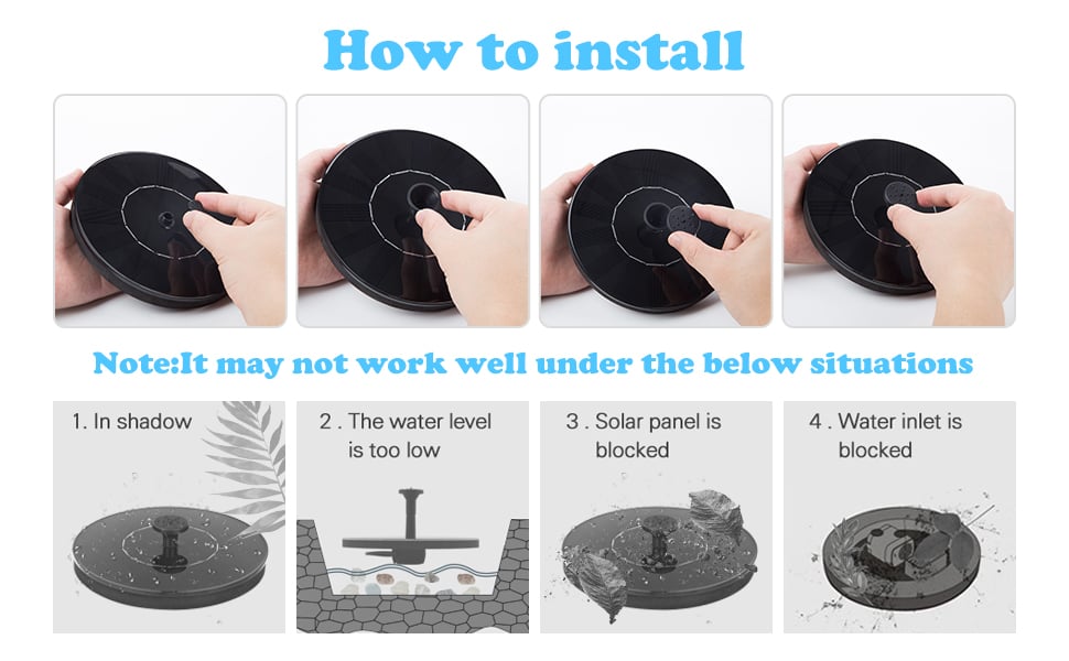 - Usage advice: Make sure you have poured enough water into the basin so that the pump can fall completely underwater. You should clean the pump regularly to avoid clogging with dust. The solar panel needs to be kept clean, and the shading of leaves or stains will affect the conversion of solar energy.. It does not store any energy, so it will rest at night to ensure a longer life.