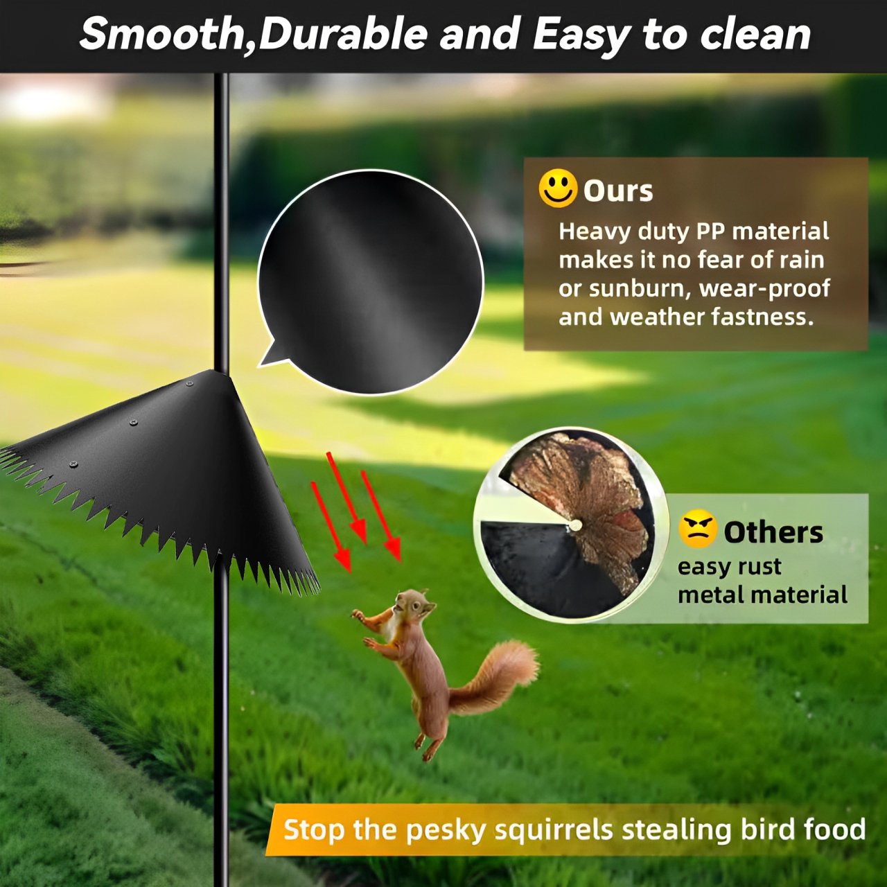 1. High Quality Material: Made of durable and rust-proof PP material, with high quality and smooth surface, it can prevent squirrels and raccoons from attacking your bird feeders and birdhouses.