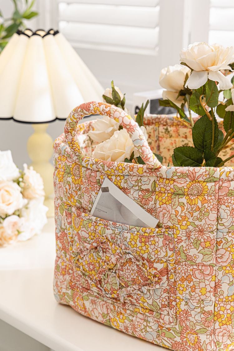 This beautifully crafted quilted tote basket features a charming floral print, bringing a touch of vintage elegance to any space. These basket adds a charming pastoral vibe to your home decor, blending seamlessly with existing furnishings.