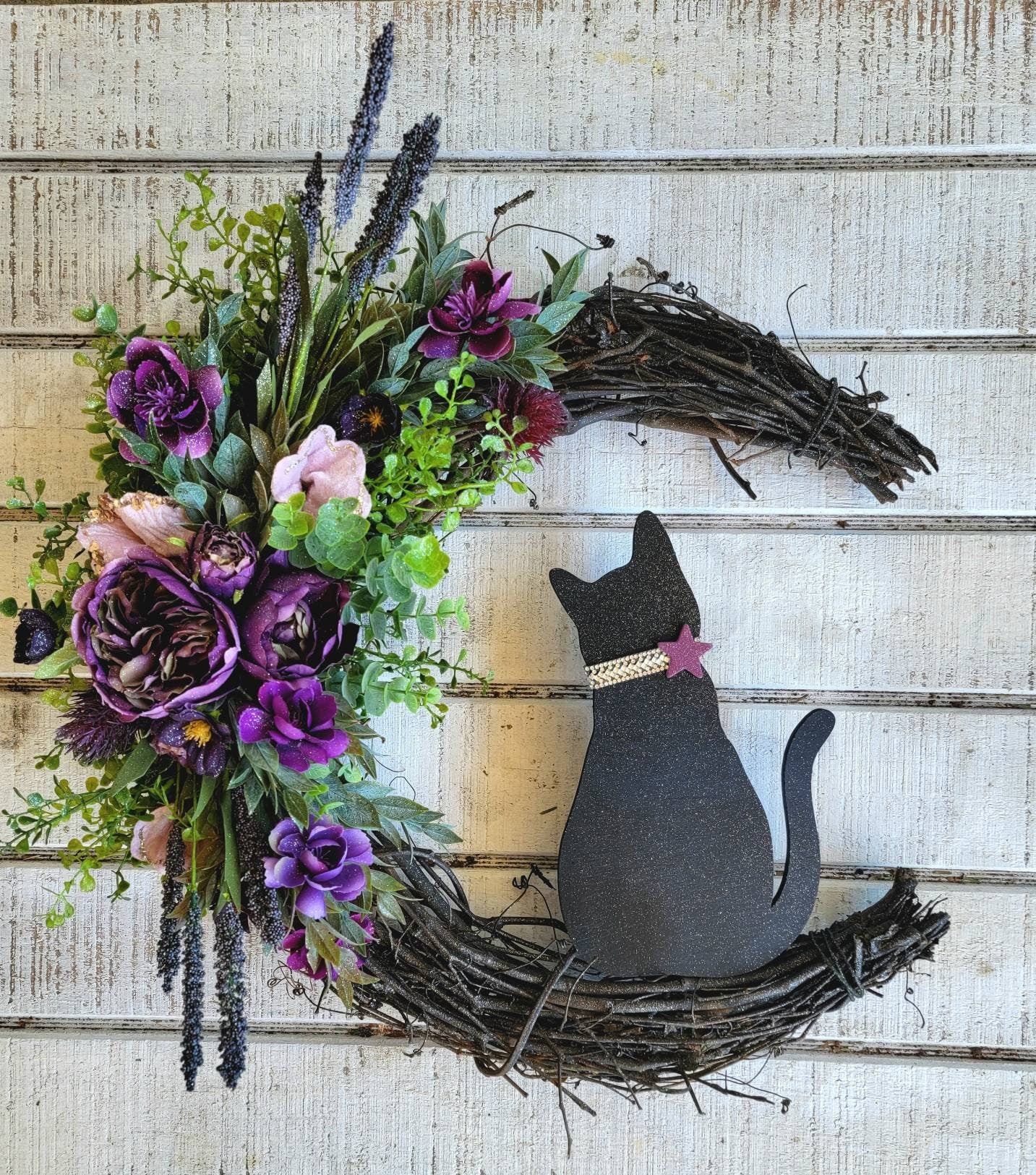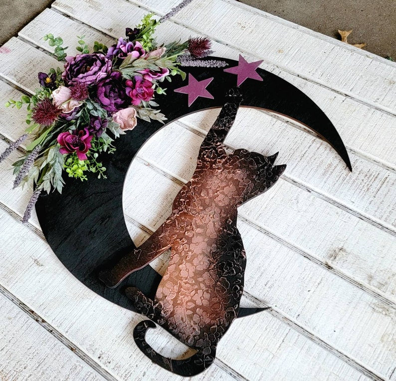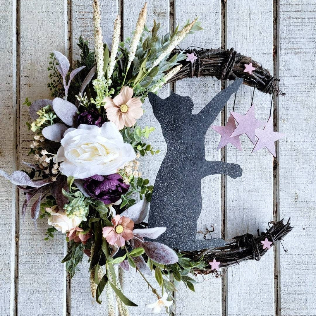 Cat Wreath Botanical Crescent Moon w/ Purple Flowers & Stars • Witchy Celestial Door Hanger • Halloween Lunar Home Decor • Kitty Lovers Gift
