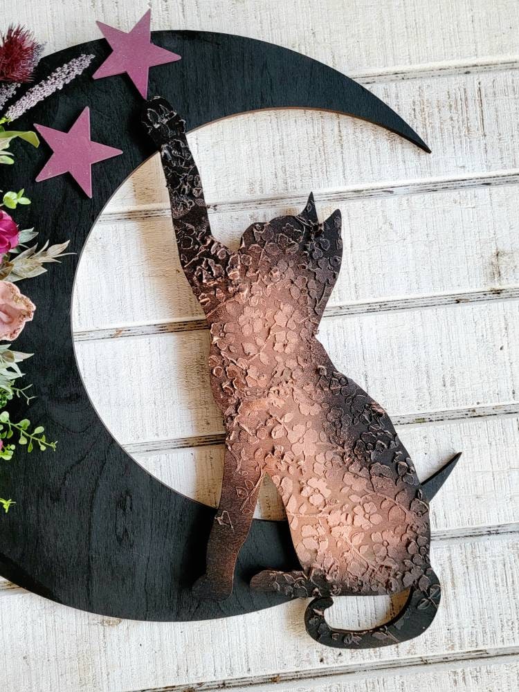 It's not enough to just wish on stars, you actually have to reach for them.💫 This LARGE patterned black and brown kitty is a statement piece that does just that! ✨️ Comes with a rope hanger on the back for a wall or door. This cat wreath makes a fabulous gift for any cat lover. All artificial for use year after year. (^..^)