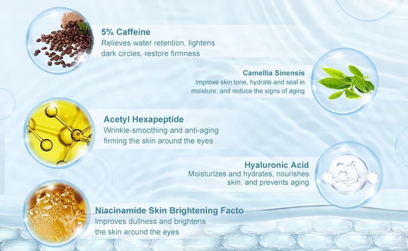 DIMINISHES DARK CIRCLES-Dongyu under eye serum contains 5% caffeine and effective on the look of dark circles that caused by lack of sleep or staying up late.The recommended usage frequency is twice a day,once in the morning and once in the evening.