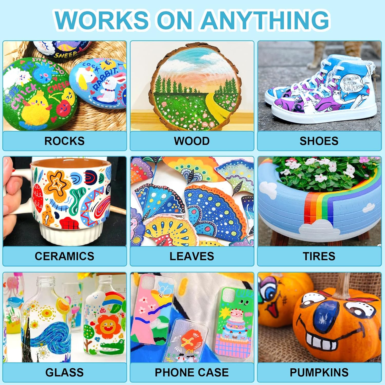 🎨Work on Multiple Surfaces: Our acrylic paint pens offer excellent coverage on numerous surfaces, including glass,stone, wood, canvas, fabric,paper, plastic, ceramic, and so on. Ideal for sketching, painting, illustrating, and DIY crafting, these paint markers deliver consistent, opaque results, unlocking your full artistic potential.