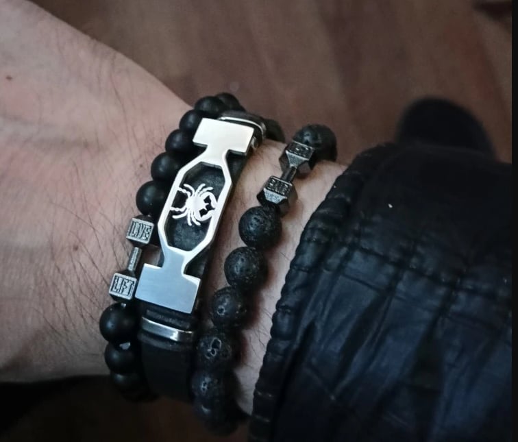 this bracelet is made of black onyx stone, lava stone and alloy dumbbell. Lead-free and nickel-free, fits the skin and is comfortable to wear,Natural Stones, Polished, Pure Handmade, Quality Guarantee.All Natural Stones Are Unique, May Be Slightly Different With The Ones Showing On The Photos.