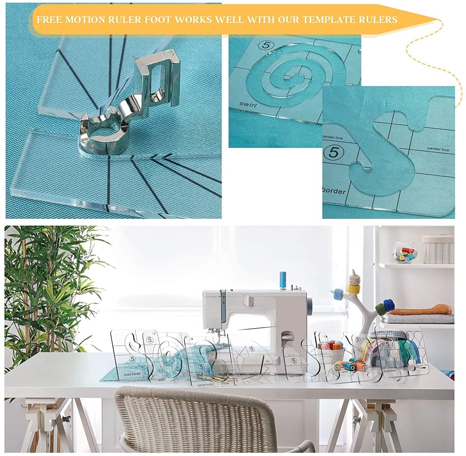 Measures and guides your stitches accurately.With stitching gap for easy footer access.