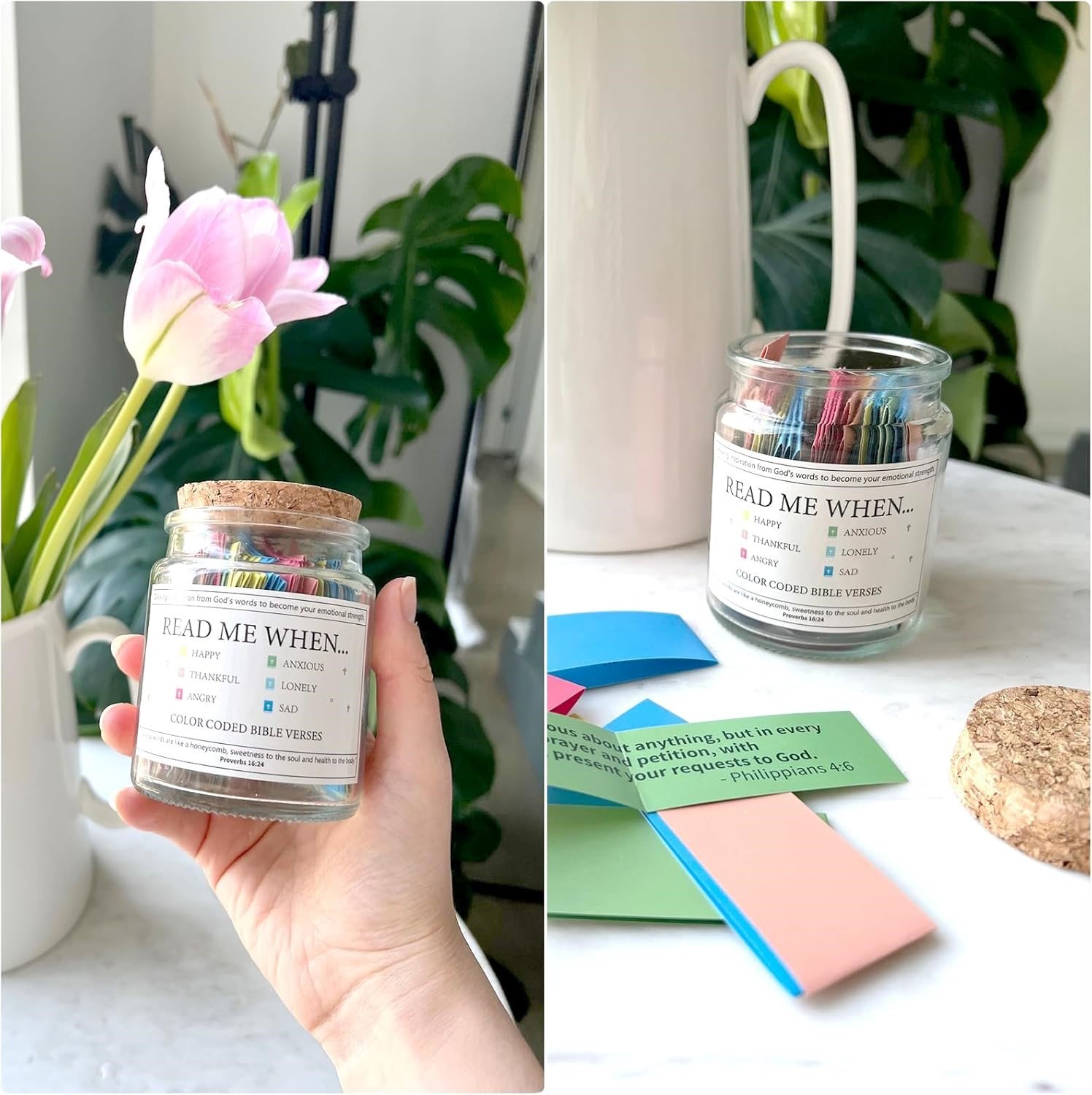 This unique Bible Verse Jar offers a beautiful way to connect with God's word and reflect on your emotions. Each jar is filled with 62 color-coded Bible verses tailored to different feelings—whether you're feeling happy, sad, anxious, angry, thankful, or lonely, there's a verse to guide and uplift you.