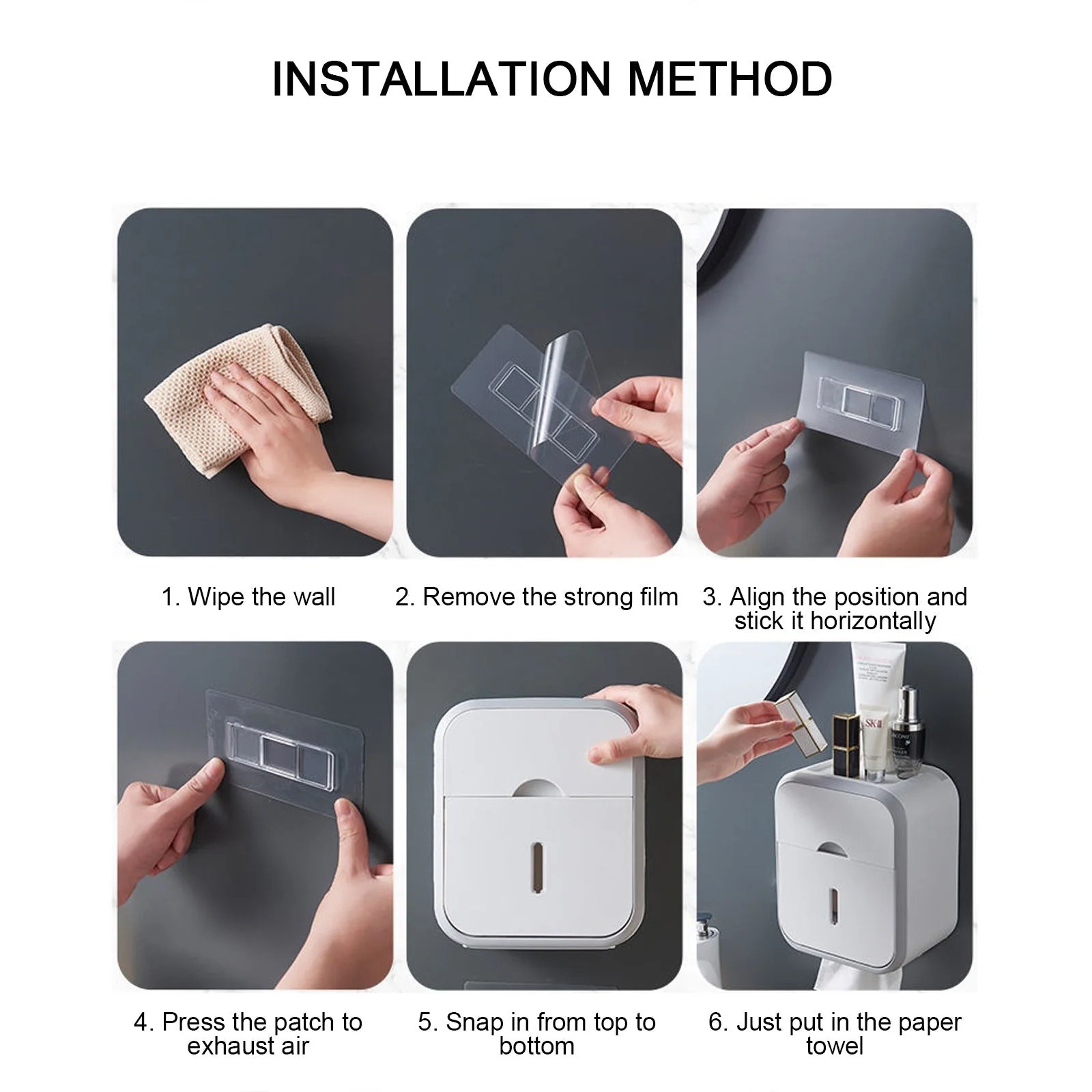 2. Adapt to the humid environment, the paper towel will not get wet when it rains, the installation method is free of punching, the bearing capacity is strong, and the adhesive is strong