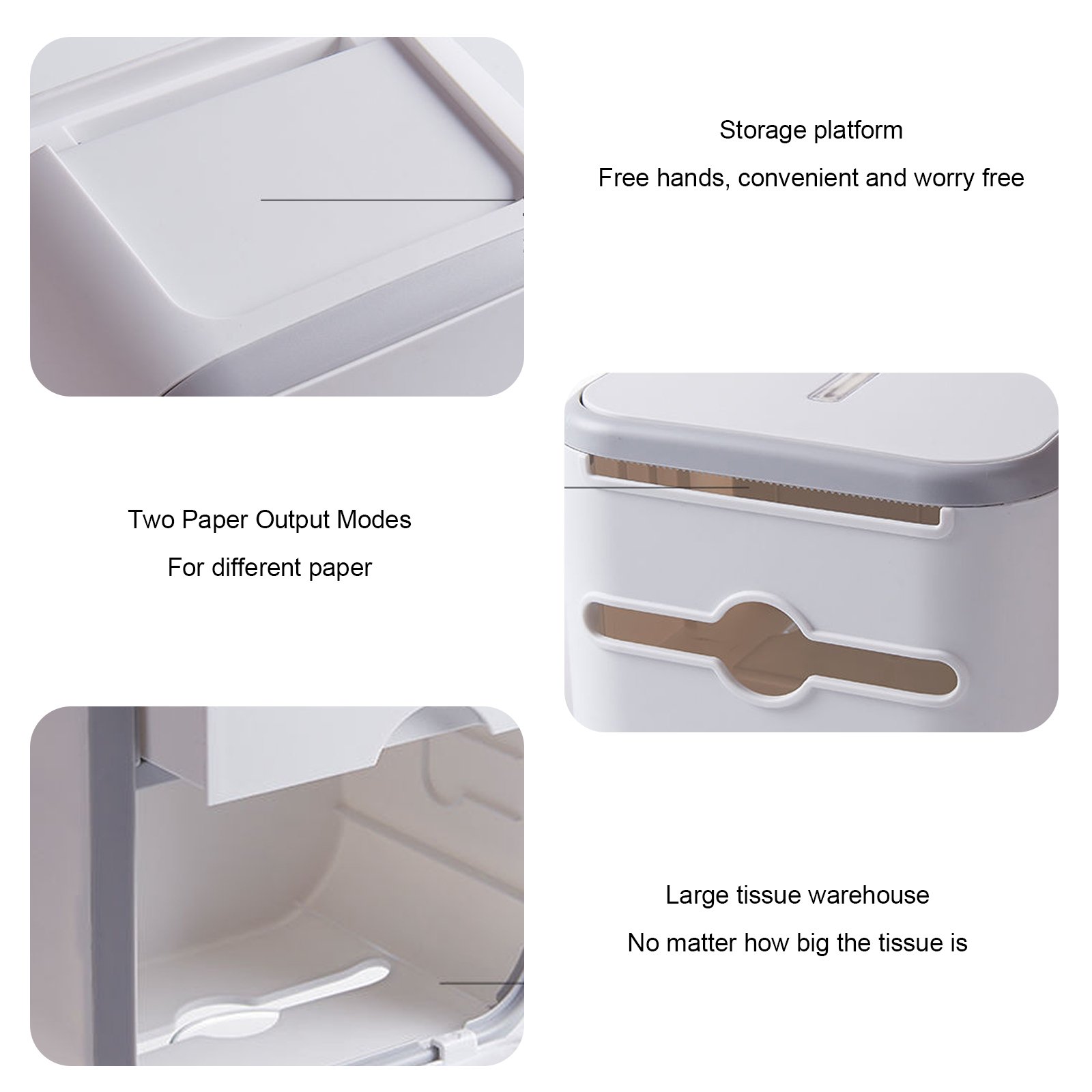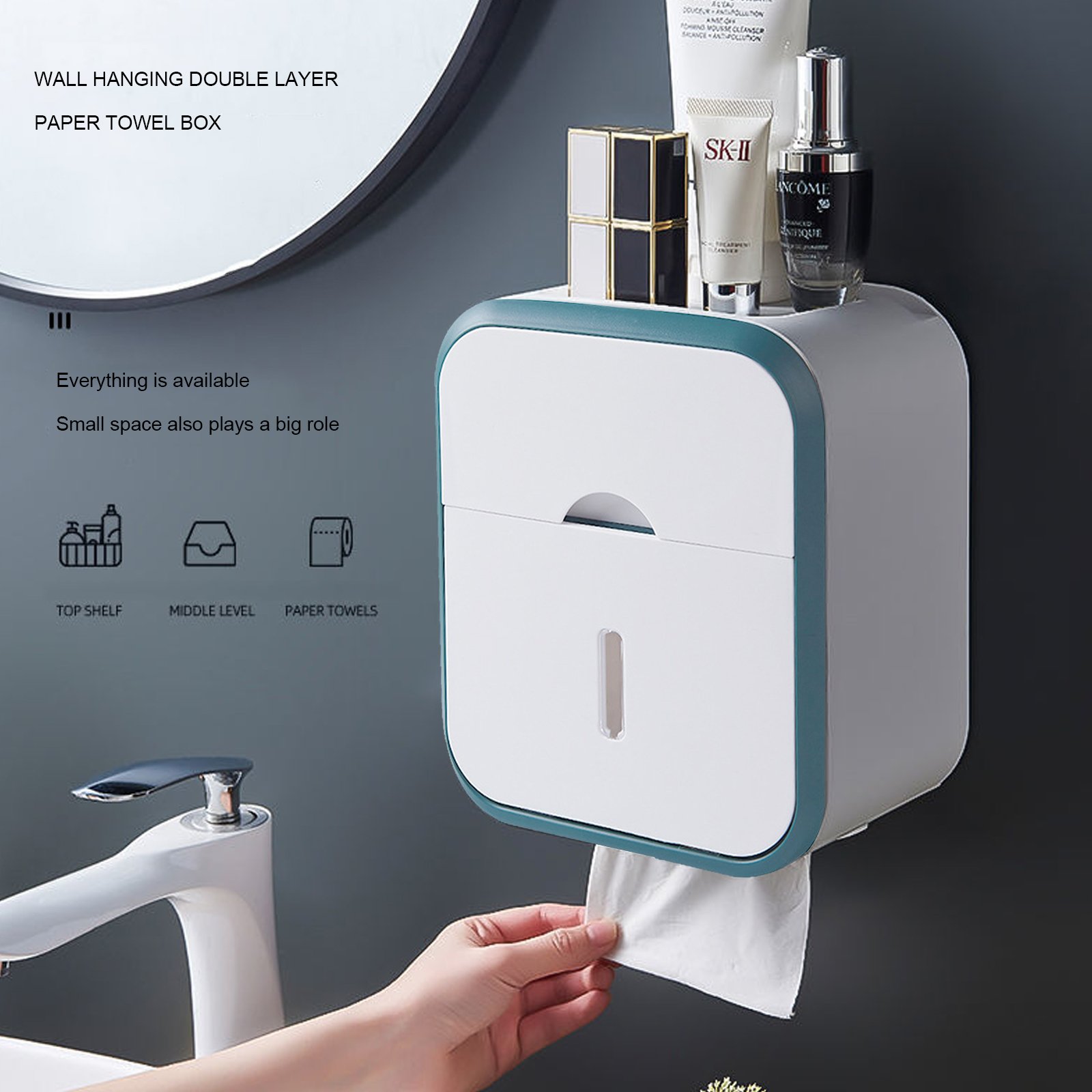1. Wall-mounted storage double-layer tissue box, the top layer is non-slip for mobile phones, glasses, watches, jewelry and small items, the middle layer is private space, privacy items, sanitary napkins, etc.