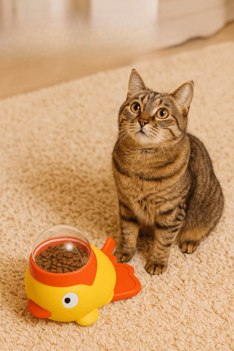 Cheerful colors, cartoon details, and a rolling base catch your cat’s curiosity—perfect for shy eaters who need encouragement to engage with their food.