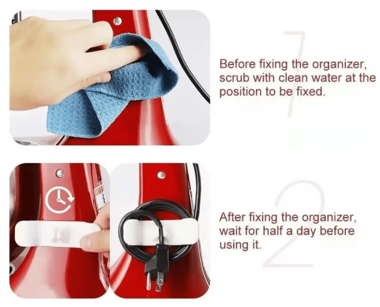 Scrub the fixed position with clean water and wait until it dries before installing the cord wrappers. After the cable organizer is installed, please wait for half a day before using it.