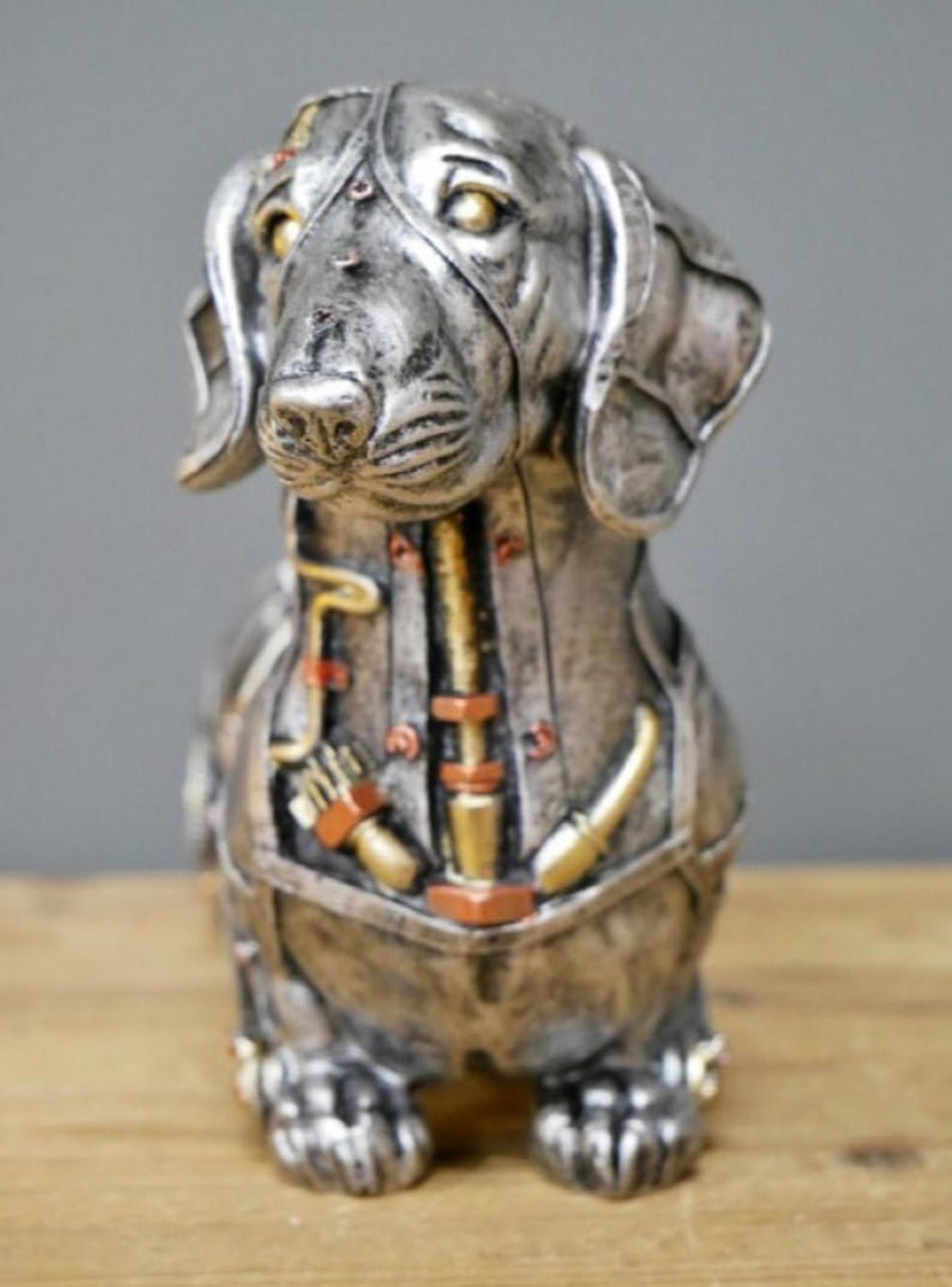 This steampunk dachshund figure is made from resin and finished in a combination of antiqued copper, gold, and silver to give it that steampunk look and feel. It’s a decorative item that will go well with any room in your house.