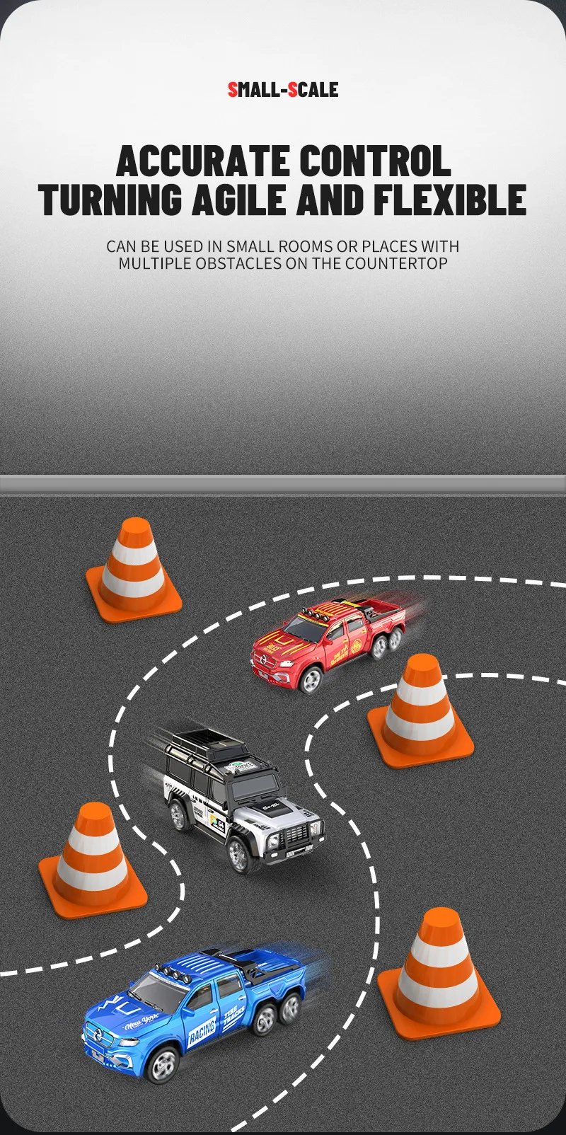 High-Performance Design: Equipped with professional anti-skid tires and a potent motor, this mini off-road car excels on any terrain, from smooth floors to rugged carpets, enhanced with realistic headlights and taillights for an immersive experience.