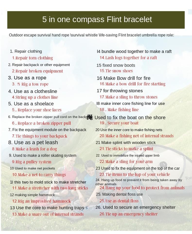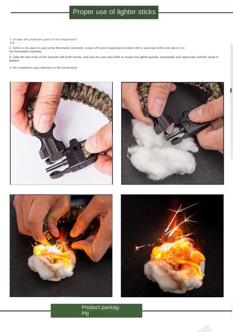 SET UP CAMP WHEN IT HITS THE FAN - Sever some small branches with the paracord rope for firewood, set your tinder and kindling ablaze with the firestarter, and tie down your cover with these paracord bracelets
