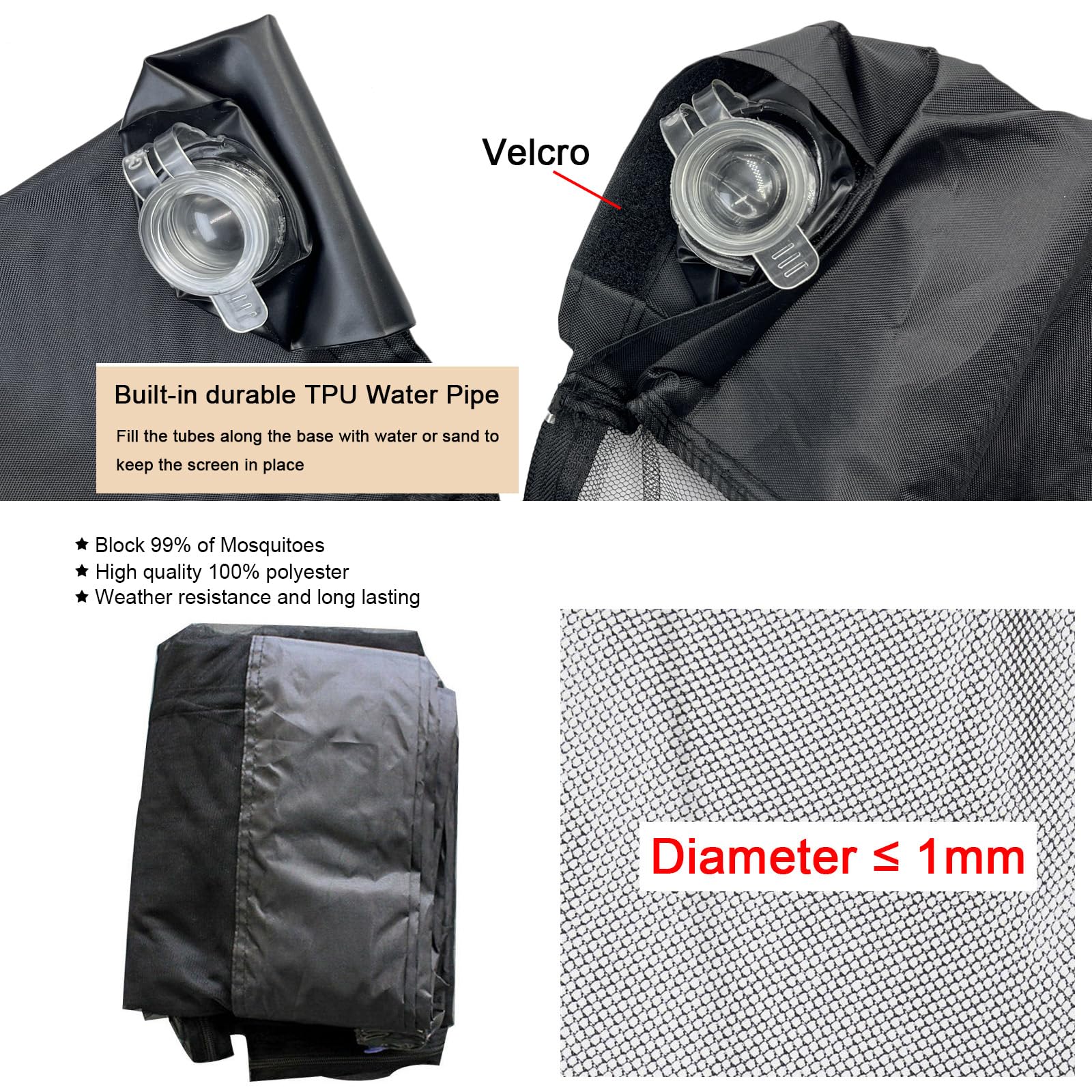 Stable Bottom: Built-in a TPU and 17 silk thickness water pipe in the umbrella mosquito netting bottom edge, good toughness and durable, just fill the tubes along the base with water to keep the screen in place, no worry about being blown up by the wind.