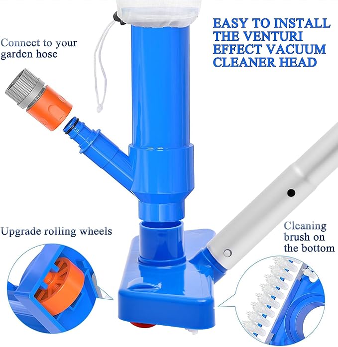 No Filter System Required --- It does not require a pump or electric vacuum to operate, just a garden hose connection to operate, by using the water pressure of the home to create a suction effect and clean the pool using the venturi effect.