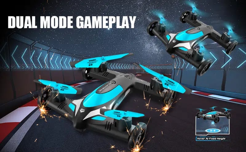This remote control aircraft has two modes: flight mode and ground mode. In flight mode, it can fly at high speed, and also has the function of intelligent fixed-altitude flight. In the ground mode, you can switch to a chariot flying at high speed. The multi-functional mode can bring you a lot of fun!