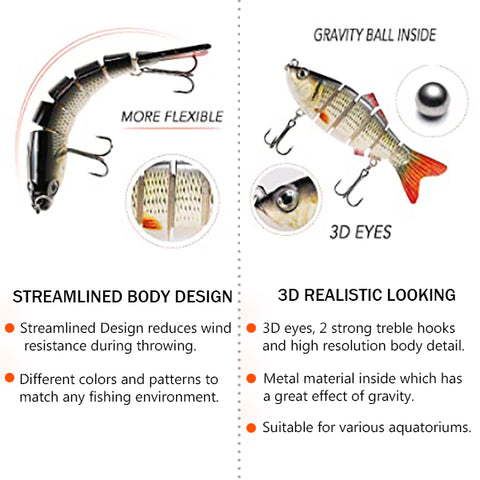 This fishing lure can create life-like swimming actions in water, attract predator to bite. If you are a fishing enthusiast, take this lure and it will increase your catches and bring you much fun.