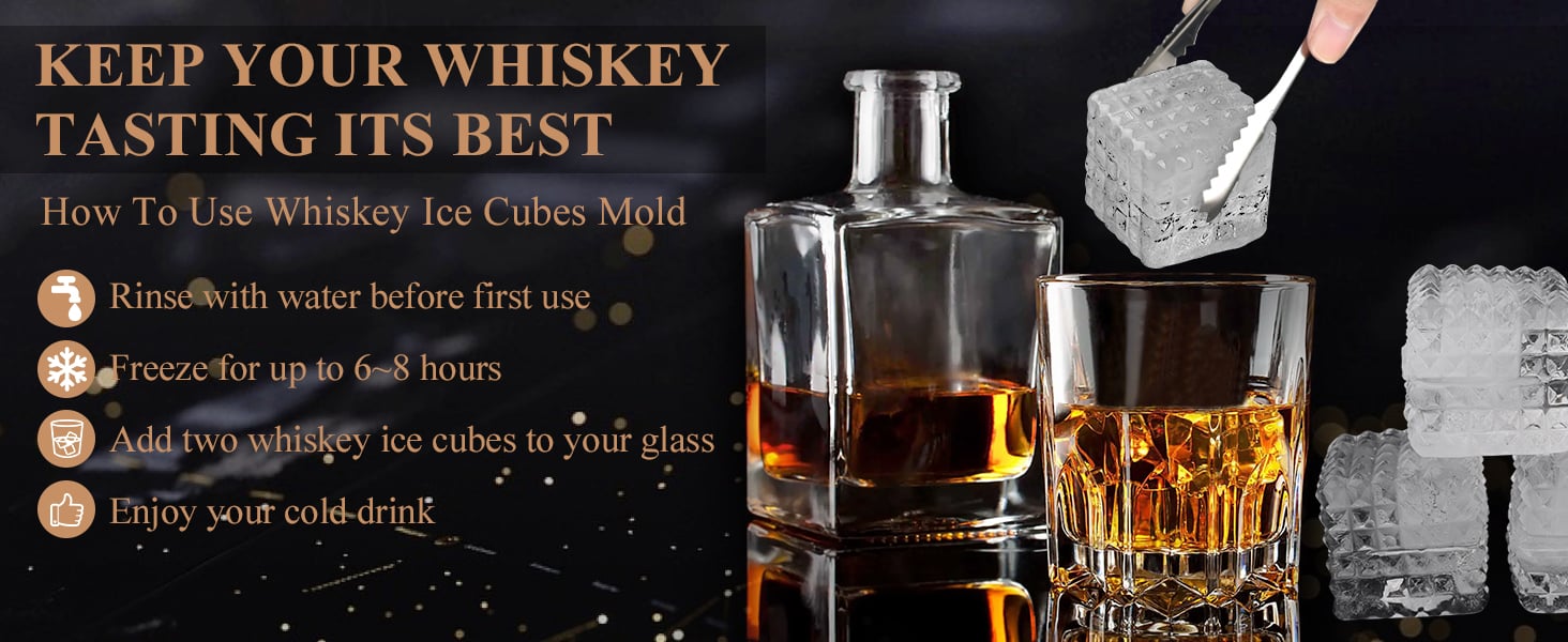 🧊Leak-free Desigh Ice Cube Mold - Our whiskey ice cubes mold are made of sturdy silicone material that ensures without any mess when transferring the mold to the freezer. The four sides of the square ice cube mold can fit tightly,ensuring that your ice tray won't spill. The leak-free design makes it super easy for you to create perfectly whiskey ice cubes. Our whiskey ice cubes mold can DISHWASHER SAFE.
