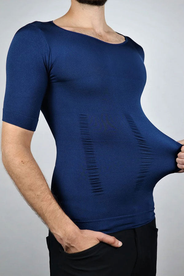 This slimming T-shirt is made using a strong weave of Nylon & Spandex. It feels tight, yet breathable and comfortable for all-day wear. Great to wear under any shirt for all occasions.