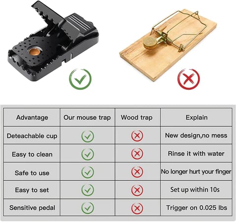 Our mouse traps are also easy to clean. Made of durable polystyrene, they are washable and won't lock in odor and stains like traditional wood traps. Additionally, they are safety and sanitary, made of high-quality materials that are a great alternative to potential hazards of chemical-based pest control products.
