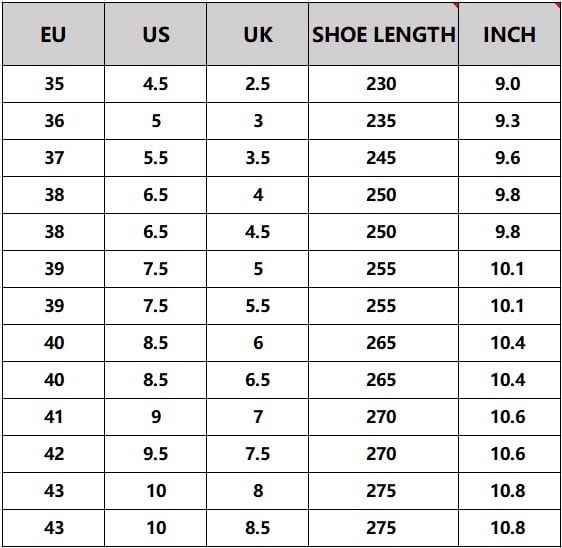 - Please take our size chart as the standard reference. Once you know your foot length, consult the Size Chart above to determine which size you should purchase.