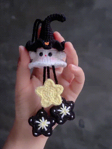 A tiny ghost in a crooked witch hat, paired with cheerful crocheted stars and flowers—this adorable design is made to charm all Halloween lovers.