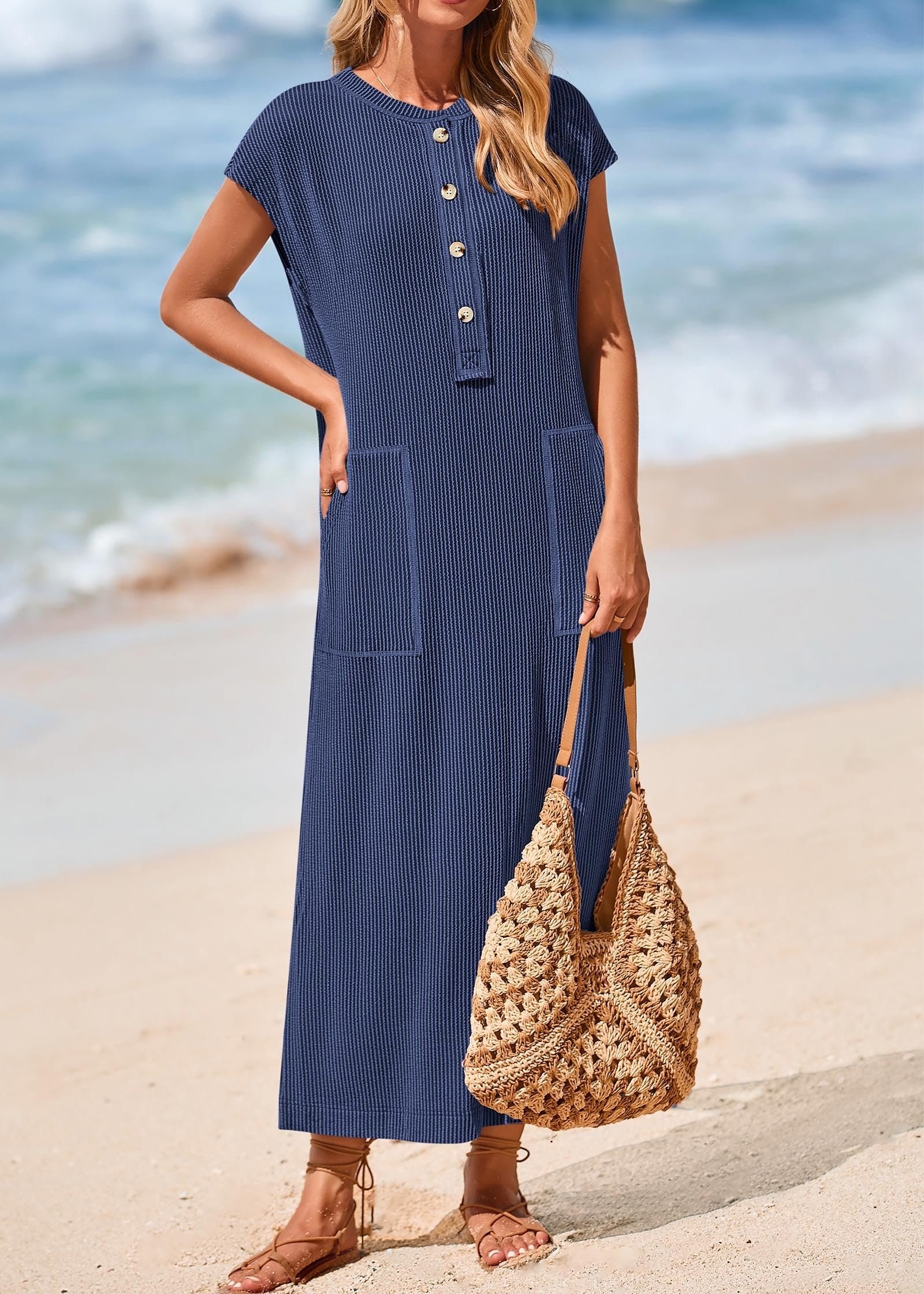 CLASSIC HENLEY BUTTON DESIGN: Features a timeless Henley neckline with functional buttons, offering a stylish, adjustable fit that adds a chic and feminine touch to the dress.