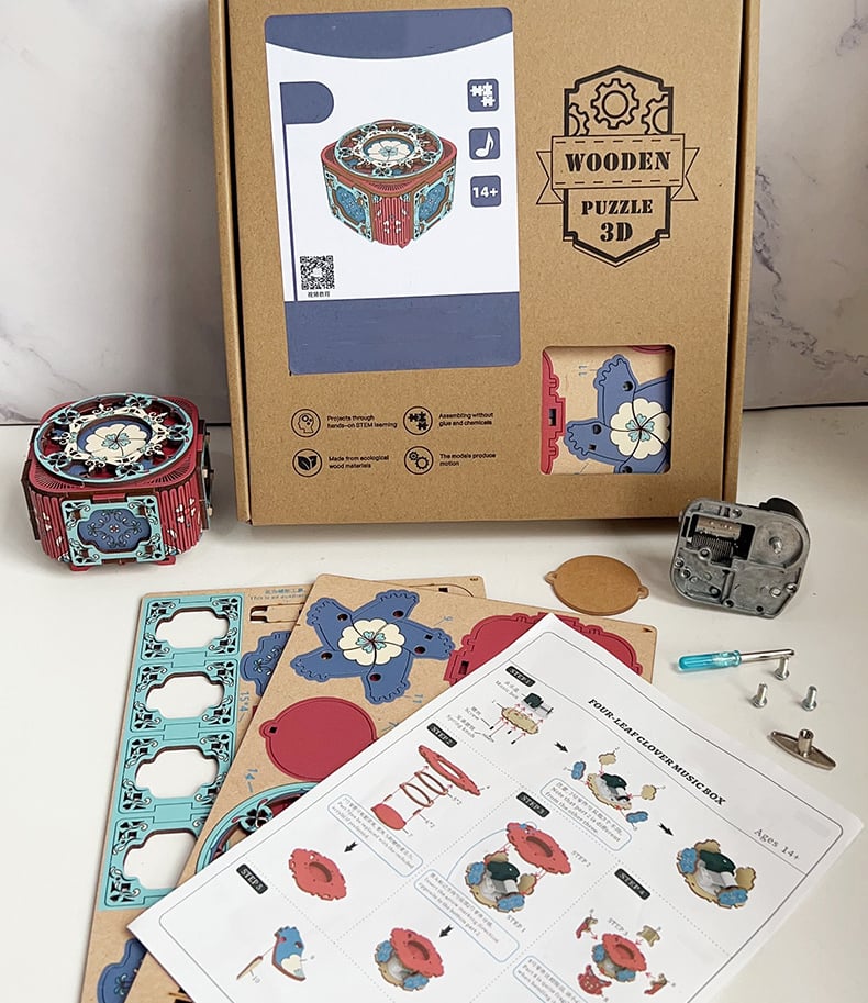 - This music box 3d wooden puzzle with pictures to aid in the construction, everything in the kit is clearly marked and labeled so that assembly is as enjoyable as possible.